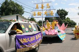 花车前排一个较大的粉色莲花坐上坐着小女孩,着粉色公主裙,象是花中的花仙,向观众挥手致意;一位西人学员头戴花环,身着丝裙,宛如仙女下凡;两位站着的学员在演示法轮大法动功,两位坐着的学员在演示法轮大法静功,尽显佛法庄严祥和。坐台上还有一位学员手抱一个天真的小男孩,笑容可掬的向观众招手,更增一份生气。