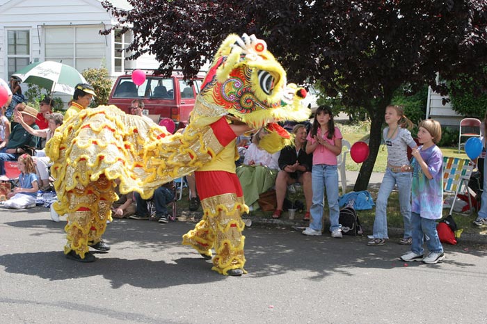 队伍中,前面是两位学员拿着镶花的“法轮大法”横幅,随后是两位学员舞狮,这狮时而跳跃,时而转身,活跃威武,又憨憨可爱。花车的两侧挂着蓝底黄字的“真善忍”英文横幅,一目了然。前部立着透明的帆,上写着中文的“真善忍”、“法轮大法”,标明花车的航向。