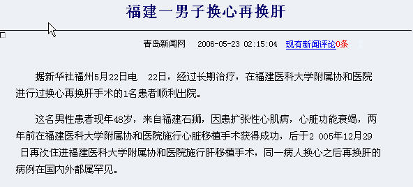 2006年5月22日,据青岛新闻网登载《福建一男子换心再换肝》,文中所述脏器来历不明,疑点甚大。见下文:
