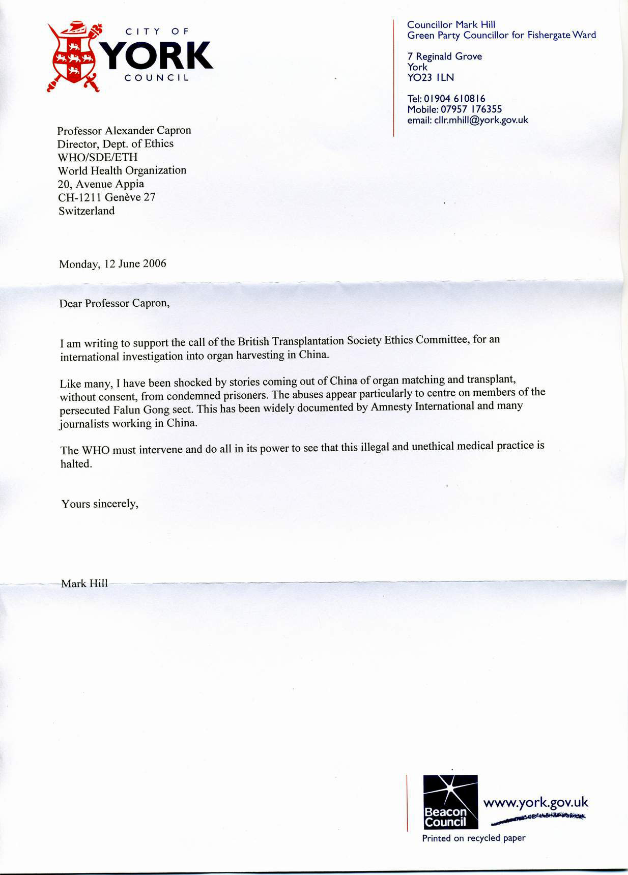 希尔议员说,我此番写信给您是为了支持英国(器官)移植协会伦理理事会提出的,对中国国内摘取器官的事件展开调查的呼吁。