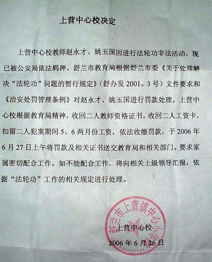 上营镇中心校有关人员竟积极配合这种犯罪行为,使得国保大队要对大法弟子赵永才非法判刑、姚玉国非法劳教。近日又做出了对两位大法弟子扣除工资的非法决定。给生活本已拮据的两个家庭雪上加霜。