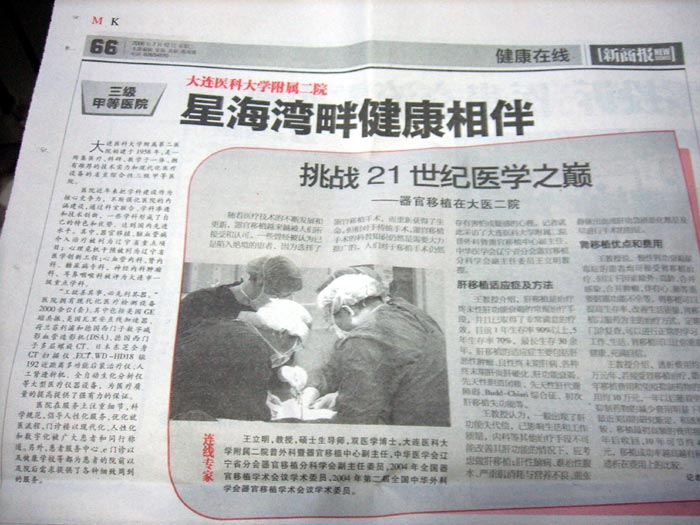 2、“挑战21世纪医学之巅”,此文刊载于大连《新商报》“健康在线”版,日期不详,有关大连医科大学附属二院器官移植。