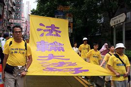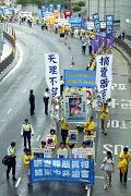 ![]() 游行队伍经过港岛中环区的中心地带 | ![]() 学员张起写着“法轮大法好”的大幡游行 |