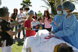 ![]() 民众观看揭露中共活体摘取法轮功学员器官的模拟演示 | ![]() 民众听学员讲解真相 |