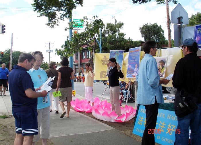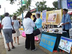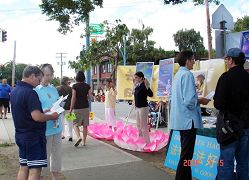 学员们一早就来到莫司街布置展位,有的炼功,有的发资料、讲真相。许多人被大法的美好吸引,禁不住驻足观看学员炼功以及“真善忍”美展的作品。小朋友们尤其喜爱学员做的小莲花,并询问如何制作。许多人接受真相资料,并和学员交谈;有些已经从最近的新闻报道中知道中共活体摘取法轮功学员器官的罪行,有些刚从真相资料中获知,非常震惊。