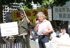2006年7月15日,德国法轮功学员在首都柏林举行集会游行,以酷刑模拟展示揭露中共对法轮功的残酷迫害,征集反迫害的签名,抗议中共摘卖法轮功学员器官的暴行,呼吁德国政府及国际社会伸出援手,共同制止中共长达7年之久对法轮功的迫害。