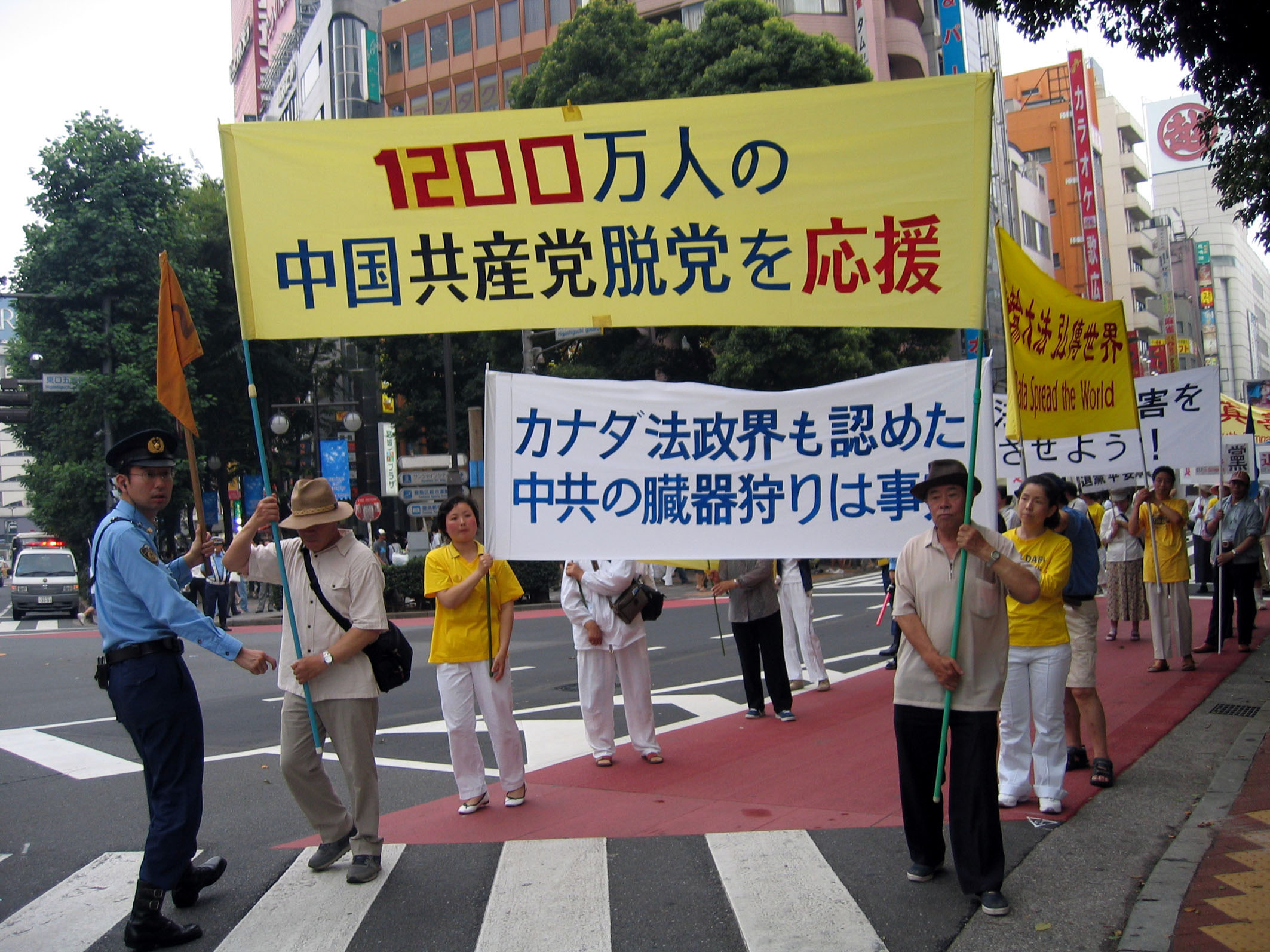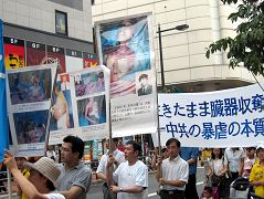 下午2点开始从池袋公园出发进行了两个多小时的抗议游行,人们手举着各种横幅和遭受残酷迫害致死的法轮功学员的巨幅照片,一边行进一边呼喊口号,并向沿途路人发送资料。