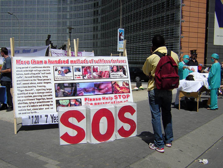 在欧盟理事会大楼和欧盟委员会大楼之间空地上,法轮功学员们搭起了中共迫害法轮功修炼者的大型展板,包括附有文字说明的法轮功学员经受酷刑致伤残的大型图片,以及近期曝光的中共强摘法轮功学员器官牟取暴利的反人类罪行的相关报道及图片。同时,一些学员真人模拟中共盗取法轮功学员器官及几种迫害酷刑。另一组学员做功法演示,和与中共的迫害形成鲜明对比。