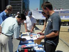 ![]() 揭露中共迫害法轮功修炼者的大型展板 | ![]() 民众纷纷签名支持制止迫害 |