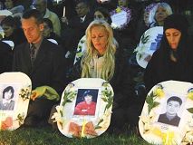 ![]() 集体炼功 为悼念会揭开序幕 | ![]() 点燃烛光 手持洁白花束 场面肃然 |