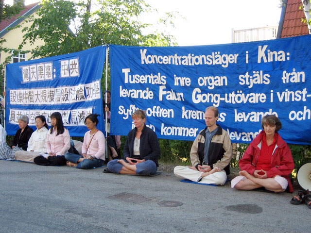 【明慧网2006年7月21日】中共从99年“7.20”开始打压迫害法轮功,已经持续了7个年头。但七年来,法轮功学员以坚韧不屈的精神坚持信仰、和平抗暴,使越来越多的人们明白了迫害真相,看清了中共的邪恶本质。中共活体摘取法轮功学员器官贩卖的惊天黑幕曝光后,人们更是纷纷退出中共及其附属组织。在中共即将走向灭亡的重要历史时刻,瑞典法轮功学员关切着中使馆商务处同胞的命运,7月19日下午5点,20多名法轮功学员来到中使馆商务处,以递交劝善信、真相资料及炼功洪法的形式,表达了对同胞们前途命运的牵挂。