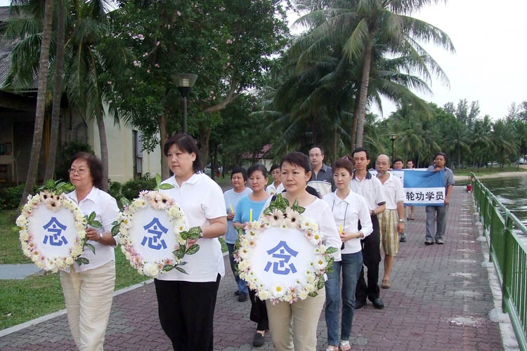 晚间的追悼仪式在河边举行。学员们手持花圈和横幅,心情十分沉重。新加坡大法弟子对于因为坚持信仰而被迫害致死的大陆同修献上哀思和敬意,并呼吁新加坡人民、全世界的政府和民众,汇集他们的良知正念,大家一起来制止这场迫害。