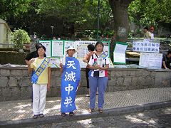 七年前的今天,法轮功学员开始蒙受了无名苦难,直至今日,数以千万计的法轮功学员,为了坚信“真、善、忍”,遭到中共残忍的虐杀、残酷的折磨,甚至发展到活体摘取法轮功学员器官盗卖、毁尸灭迹的恐怖暴行。为了制止这场惨无人道的迫害,为了唤醒人们的道德良知,不再被中共邪灵操控利用来迫害法轮功,七年来,澳门法轮功学员和全世界的法轮功学员一起冒着严寒、顶着酷暑,不断的向人们讲真相。这七年,澳门法轮功学员在景点讲真相活动,也经常遭到民政总署和警方的不同程度的干扰,法轮功学员呼吁人们特别是执法公务员切勿为了个人短暂的现实利益,屈服于中共恶党。