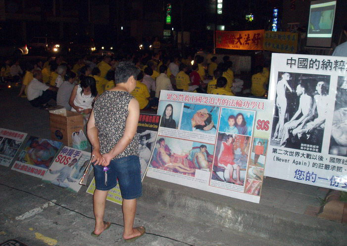 ![]() 抗议中共活摘法轮功学员器官的暴行 | ![]() 现场民众详看迫害真相展板 |