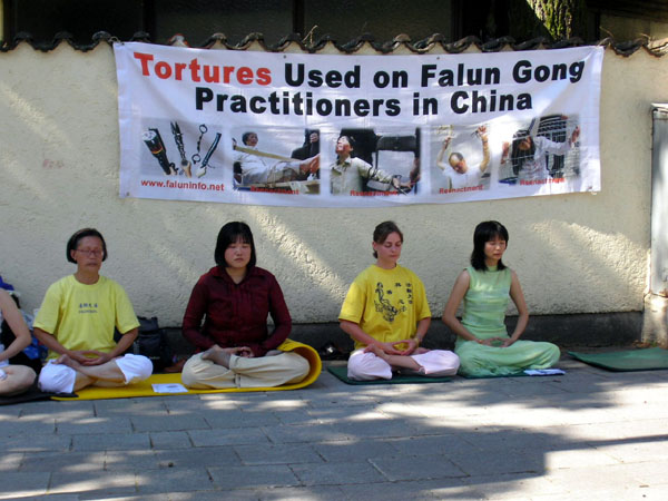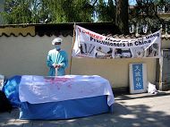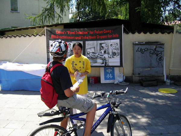 法轮功7周年之际,德国巴划利亚的部份法轮功弟子来到慕尼黑中国领事馆前,抗议中共恶党惨无人道活体摘取法轮功学员的器官的罪行。法轮功学员挂了抗议恶党活体摘取法轮功学员的器官的横幅,摆了模拟活体摘取器官的手术台。在中领馆前的大法弟子感受到,活体摘取法轮功学员的器官是邪恶最怕曝光的事情,也是最能让邪恶解体的事情。