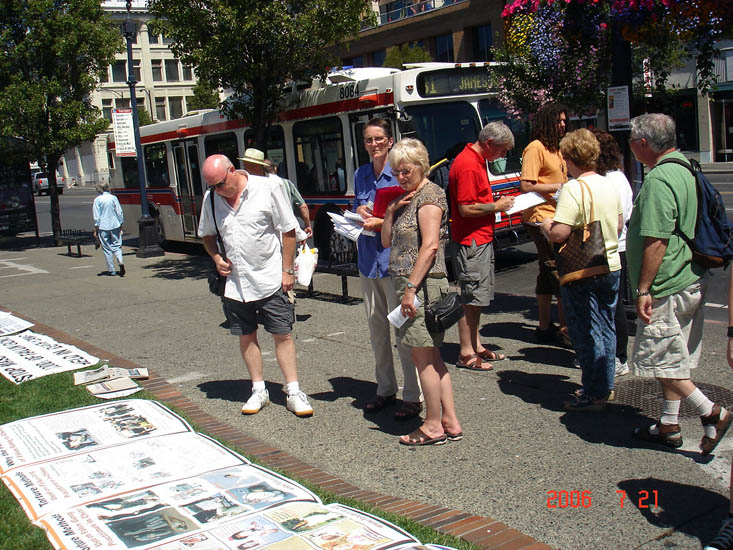 2006年7月21日中午,加拿大维多利亚市法轮功学员在市政厅前面的草坪上举行集会,揭露迫害。现场摆放了九评图片、揭露中共酷刑迫害法轮功学员的图片和活摘器官图片,让更多的民众了解和认清中共的邪恶本质,呼吁人们共同来制止中共的暴行。