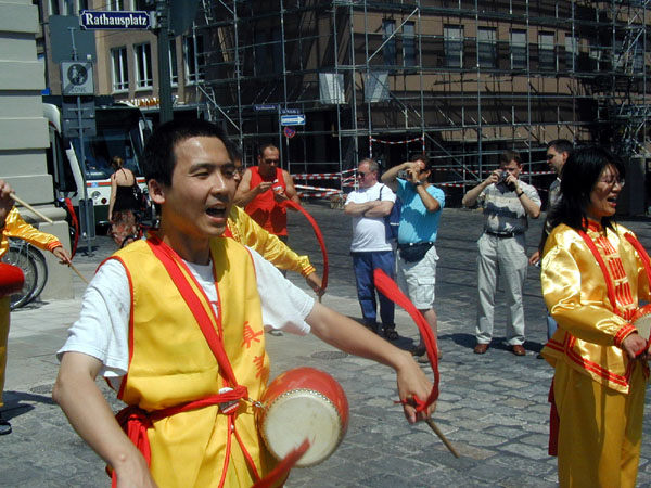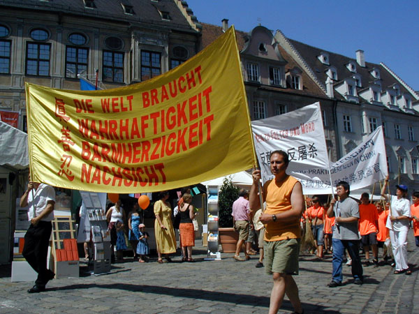 ![]() 法轮功参加奥格斯堡城市和平行动图 | ![]() 法轮功腰鼓队在行進中,民众纷纷留影 | ![]() 在和平行动中揭露中共迫害法轮功及活体摘取法轮功学员器官的罪行 |
