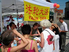 【明慧网2006年7月24日】(明慧记者德祥报道)“刚才你们的游行队伍很吸引人,我想進一步了解法轮功。”不少德国民众来到法轮功的展位前,对学员表达了以上的信息。