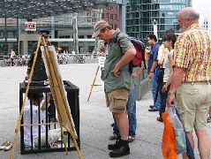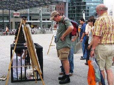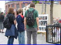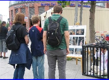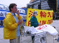 反酷刑展和揭露中共活摘法轮功学员器官的真人模拟演示最能震醒人心;同时,一位学员在旁边用扩音器作讲解,这样揭露邪恶的效果非常好。信息台起到了很好的作用,用多种语言印刷的传单也很快就全部发完。