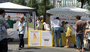 在曼海姆市中心,往来的行人很多,人们看到反酷刑展,听到喇叭里叙述的迫害详情,无不驻足,震惊之余,纷纷走到展位的桌子前签名,表达对中共暴行的谴责。
