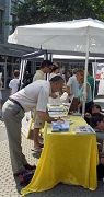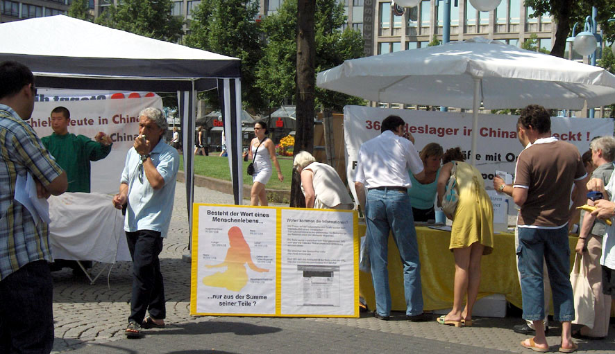 烈日当空,骄阳似火,空气象凝固了一般,这是德国少有的暑伏天。一位德国妇女很敬佩的对我说,模拟关在笼子里的那个女士真了不起,这么晒,她怎么受得了?我告诉她,现在笼子里的女士只是模拟,中国的真实情况比这个要严酷的多。我们就是因为要把这种暴行公诸于世,唤醒民众的支持,所以才能、也情愿忍受现在的这点辛苦。这位妇女点头称是,走到桌边签了名。