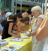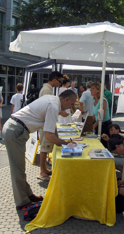 一位亚洲女子用德文对另一个德国妇女表示,应该广泛传播这种信息,让德国人都了解中国的真实人权状况,制止暴行。她要了几份空白征签表格,准备放在自己的诊所征集签名。她是一名助产士,来自菲律宾。望着她,我若有所思,曼海姆是我生活过十几年的地方,刚才我还遇到了原来的邻居。后来看到她留的名字,我猛然想起,她就是9年前帮助过我的那名助产士!急忙在人流中寻找,却早已不见了她的身影。在此我想说,GINA,谢谢你,更衷心祝福你!