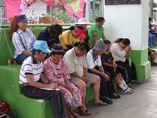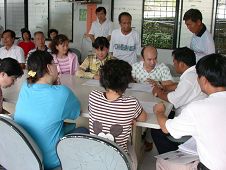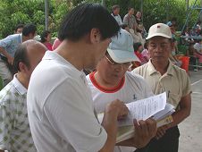 ![]() 向三和村的钟牧师讲真相 | ![]() 排湾村的杜村长仔细的听学员讲解 |