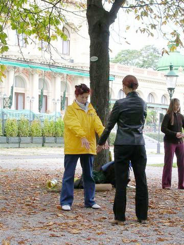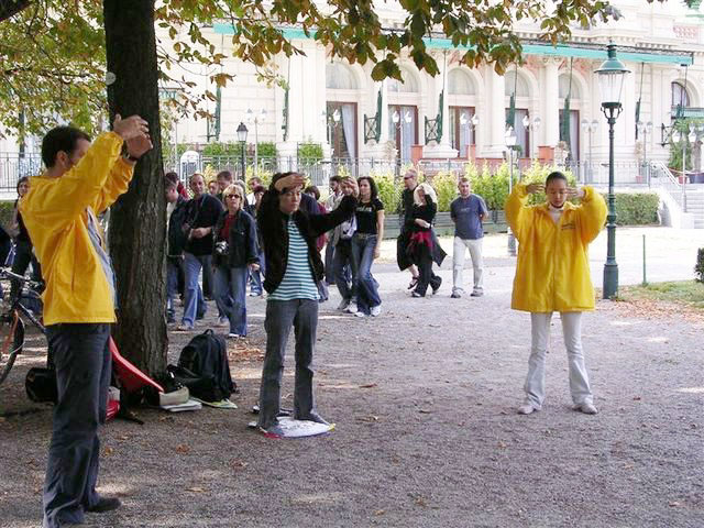 其实她以前就已经见到过法轮功了,只是那时她还不知道这是什么。“我那时在欧博拉(Oberlaa)参加一个课程。当我从窗口望出去,我看见一组人在公园的草坪上炼功,真好看。”她现在讲起来还充满向往。“整个都在绿色包围下,那草坪,那些树,然后是那么和谐的功法。我简直入了迷。我只是想,‘我也要学。’”当她来到下面时,那些人已经走了。后来她才知道,她看到的就是法轮功功法。就这样,梅兰妮也开始修炼起法轮功并参与了同修们的反迫害和讲清真相的活动。