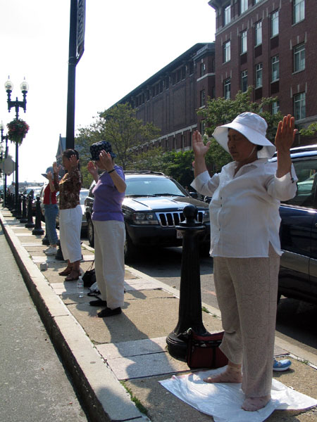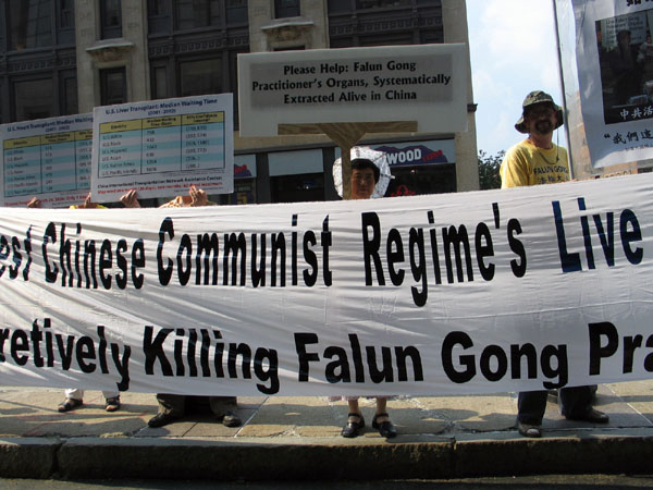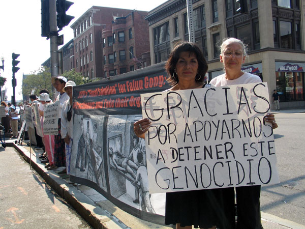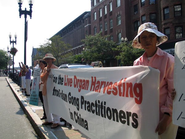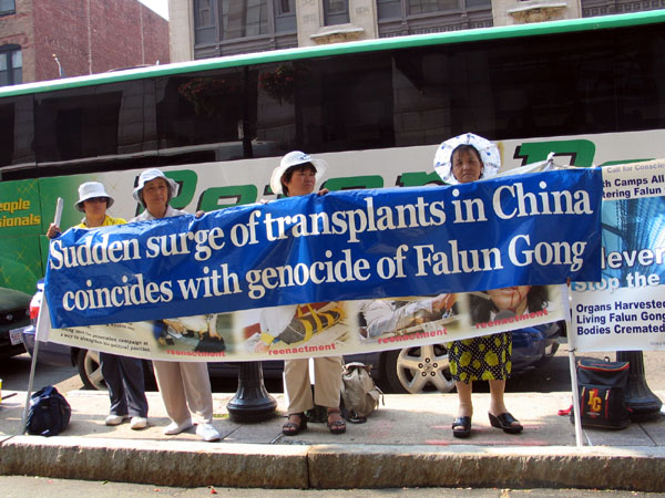 “我们是22号晚上坐夜车来到波士顿的。第一天来到移植会场外,许多中国人看着我们的横幅标语,但很少有人敢接我们的资料。可西方人都接。当时我举着横幅站在街边。我看他们不接资料,心里很着急,于是我大声对同修喊:嘿,你看看追查国际名单上有没有这些大陆医生的名字!