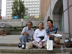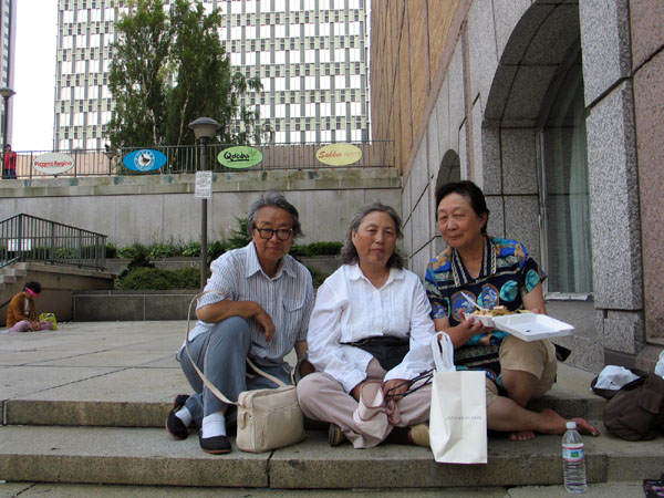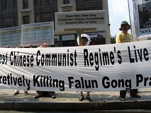 还有一位老妈妈,2006年刚来到美国。今天她的身体不舒服,在这么热的天里,她依然站在那举着横幅标语。老人说,不管怎样,讲真相救人最要紧。
