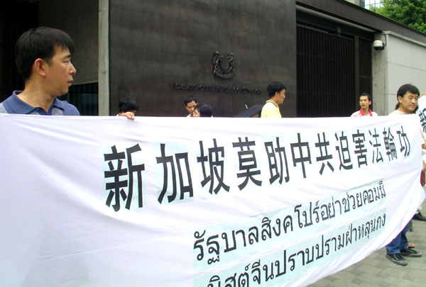 学员在新加坡使馆前打出了“新加坡莫助中共迫害法轮功”、“呼吁新加坡政府撤销对法轮功学员的无理起诉”的横幅,并宣读了公开信。