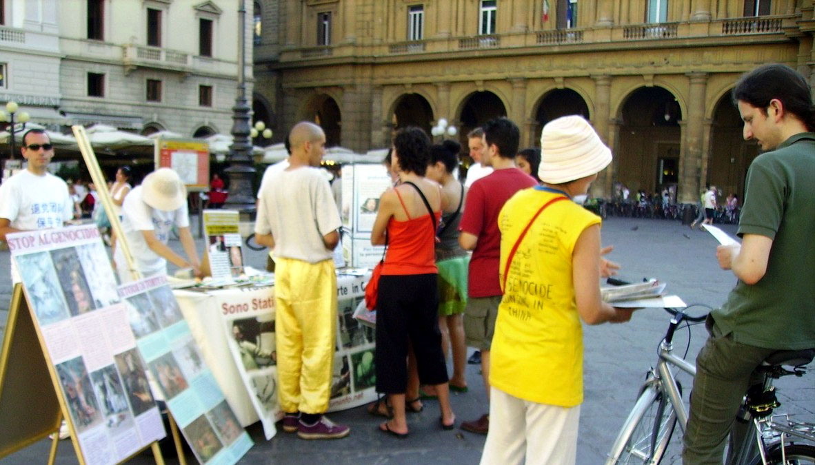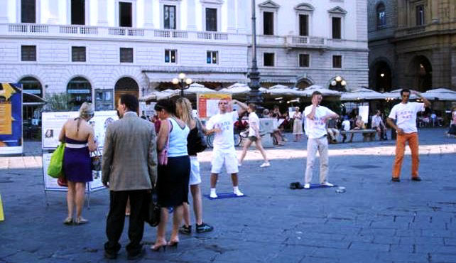 在佛罗伦萨中领馆前抗议的学员结束了上午的抗议活动后,又在40度的高温里在佛罗伦萨市中心的共和国广场举办活动,呼吁人们帮助结束在中国长达7年对法轮功学员的迫害,制止中共暴政。