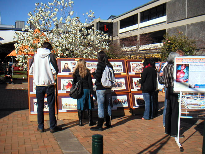 当天阳光灿烂,络绎不绝的学生在摄影展前穿梭不停。许多学生已明白法轮大法好,修炼法轮大法是信仰“真、善、忍”的。