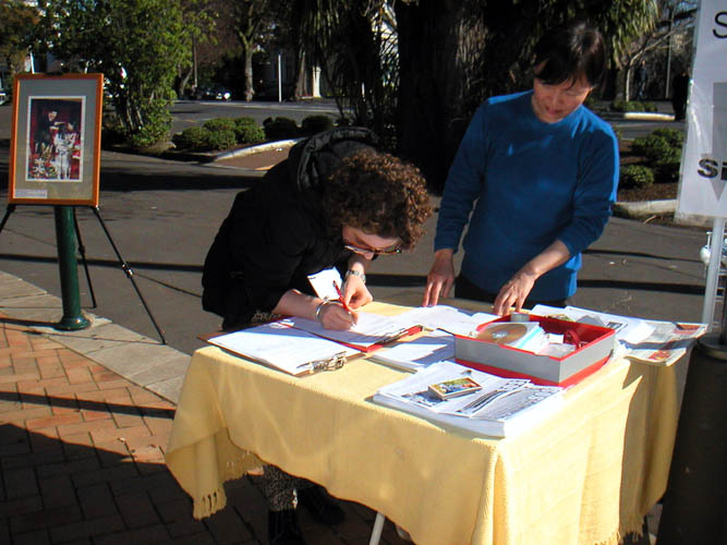 上图中这位在新西兰长大的学生,是奥克兰大学的研究生,准备写有关历史研究的论文,看了摄影展后他想从共产党的历史这个角度写中共为什么要迫害法轮功这群信仰真、善、忍的好人,并且惨无人道的活摘法轮功学员的器官牟取暴利。法轮功学员认真的告诉他:你好好看看《九评共产党》,就会了解共产党邪恶的历史,就能写的出来了。他表示一定要好好读《九评共产党》,跳出老套的框框来完成这篇论文。他还签名呼吁尽早结束中共对法轮功的残酷迫害。