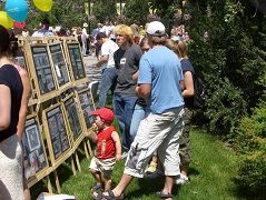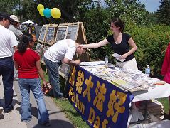 ![]() 游人观看法轮功真相展板 | ![]() 法轮功学员向游人介绍法轮功 |