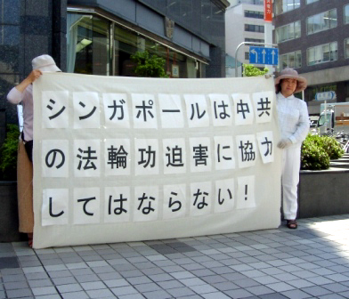 最近,新加坡当局在官司缠身的前中共610头子李岚清访问新加坡之际,为讨好邪党,非法控告于2005年10月22日、23日在新加坡地铁和商业街发传单的9名当地法轮功学员。在此前新加坡当局就配合中共新一轮对法轮功的诬蔑而开始了一系列针对法轮功学员的迫害行为,如接连发生吊销法轮功学员工作许可,甚至对多名派发传单的法轮功学员進行控告等事件。新加坡当局此等表现绝非一民主国家应有之举。近畿学员就此打出横幅,劝诫新当局不要做中共邪党的马前卒。