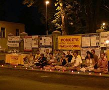 夜幕降临,法轮功学员点起一根根蜡烛,悼念在中国大陆被迫害致死的同修。一位学员告诉路人,“到目前中共用酷刑和暴力迫害法轮功已经7年了,法轮功学员也在用自己的行动展示着他们的洪大的容忍和慈悲,捍卫着人间的正义和真理,在讲真相中不断的走过来,直到今天。历史明白的告诉人们,真理最终会展现在世人面前。中共政权谎言的阴云终会在真相大白于天下时消失遁形。我们今天用烛光悼念逝去的同修。很让人难过,死难者中有很多妇女和孩子。”