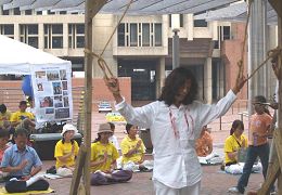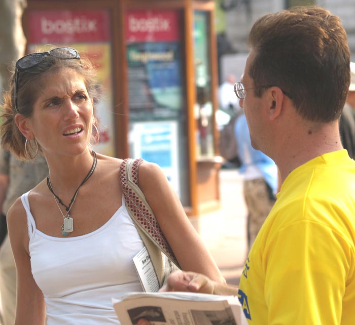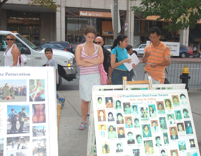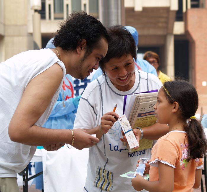 许多人知道真相之后在现场就落泪了,表示要帮助受迫害的中国法轮功学员。有些要买《转法轮》书,有的当场就读起《转法轮》。一个宗教团体说:“我们要为法轮功祈祷。”