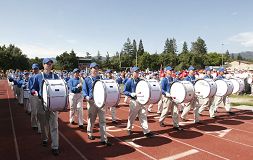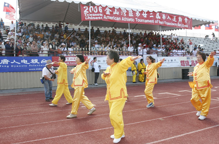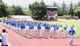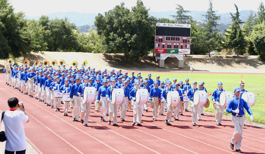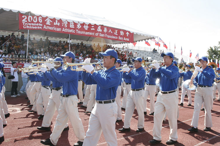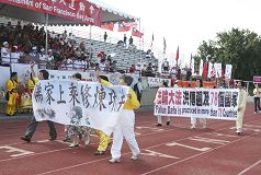 今年的华运会有70多个团体参加。开幕式一进场就可以看到五尺长的绣有“法轮大法”的横幅。法轮功美西天国乐团在大会开幕式入场时表演了“法轮大法好”乐曲,获得了观众的热烈掌声。乐队表演后队伍走到列队场地时,还受到了运动会参赛者们的掌声。有的人走到乐队前说:“你们真棒!”