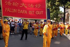 在世足赛城盖尔森基辛市 法轮功学员大游行(图)