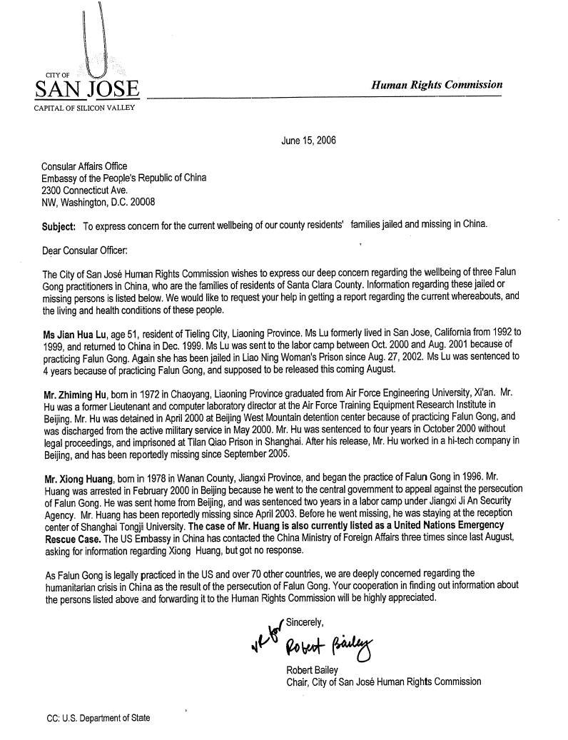 圣荷西市人权委员会对三位法轮功学员在中国的安全表示深切忧虑,他们是圣塔克拉拉郡(Santa Clara County)居民的家属。下面列出这些被监禁或失踪人士的消息。我们要求你帮助获得有关这些人现在何处、生活和健康情况的报告。