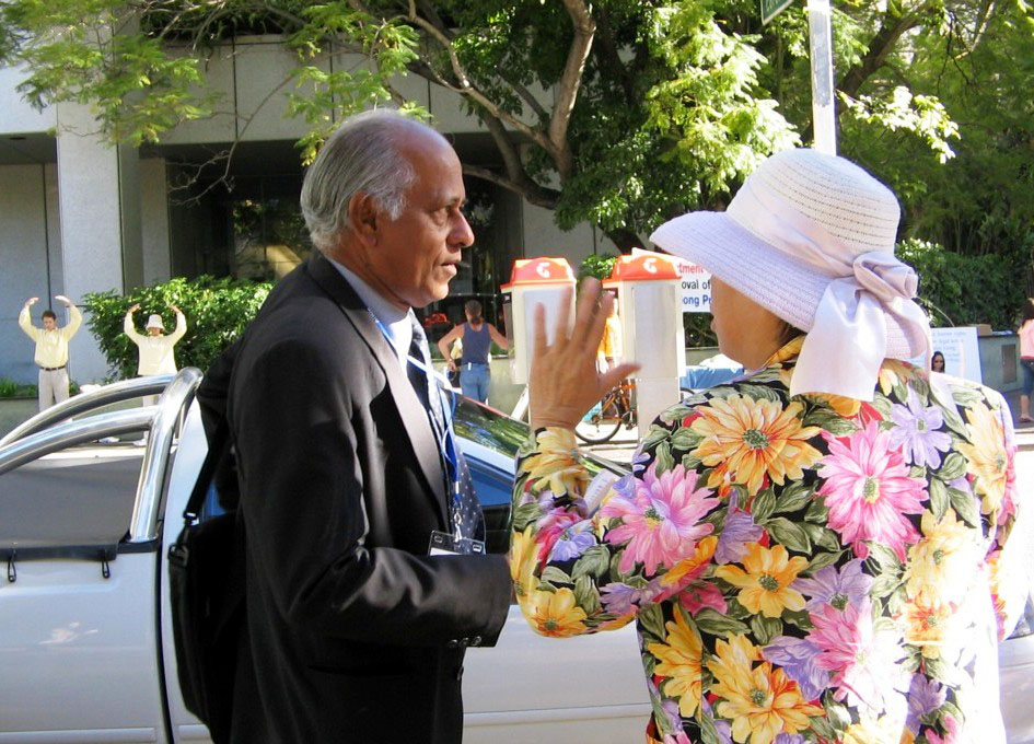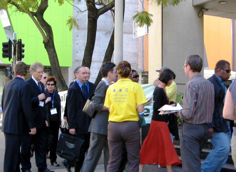 大约下午三点,与会律师纷纷向法院走来,鱼贯而入,法轮功学员上前派发资料、讲真相。律师们被这种场面吸引住,纷纷转过头来注视着,他们脸上流露的神情,表达了他们对中共暴行的震惊和愤慨。