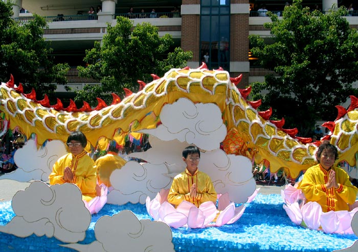 ![]() 法轮功学员第六年受邀参加红木城独立日游行 | ![]() 精美的花车 |