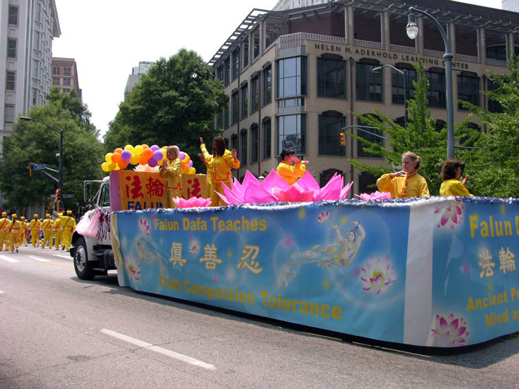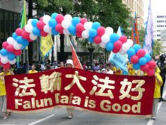 今年的气温比往年都高,但是观众却不比往年少。一路上,观众们对法轮功学员精心准备,展现法轮大法美好殊胜的花车赞不绝口,而轻柔、缓慢的功法表演也成为游行的一个焦点。法轮功学员表演的腰鼓得到了观众们的热烈掌声,有趣的是,很多人还模仿着他们的动作,打着鼓点子。由学员们扮演的仙女们一路散发着印有“法轮大法好”书签的小莲花,莲花受到了观众的欢迎,很多孩子们围着仙女,等待仙女给他们小莲花。