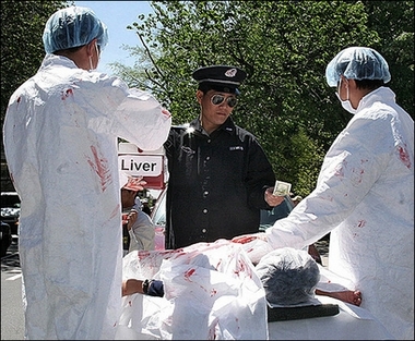 法轮功学员于2006年4月在华盛顿DC抗议非法摘取人体器官时演示这种非法贩卖行径。(法新社)