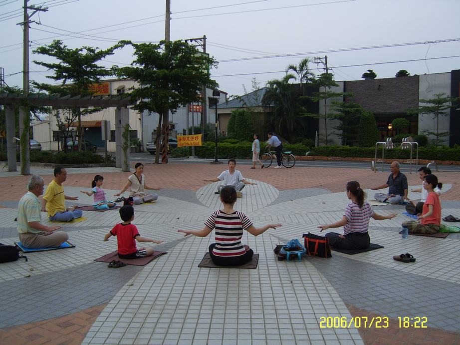 排成一圈坐着的学员,其实真正住在附近的只有一、两人,其他的都是住在较远的地方。其中有一家四口住在莺歌,每天骑摩托车往返要二、三十分钟,当初为了让附近居民有机会学炼法轮功,几位学员都愿意长途跋涉来此建这个炼功点。