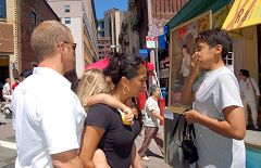 一位犹太后裔,看到法轮图形中卍字符误以为希特勒使用的那个符号,情绪有些激动。学员向他解释卍字符的涵义,还例举中共活摘法轮功学员器官、焚尸灭迹一事,表示理解他的心情,但我们的卍字符与希特勒没有关系,他是很神圣的。他听后平静下来,感谢学员的解释,还友好的建议贴些相关资料,以避免误会。