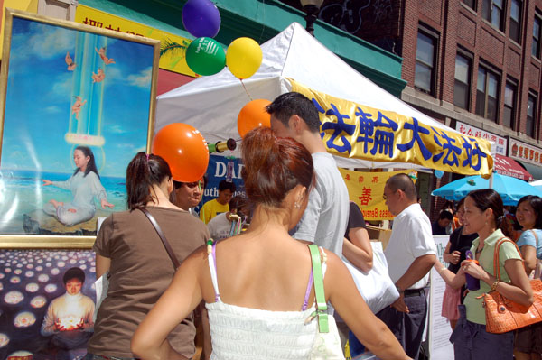 ![]() 法轮功学员展位前的人群 | ![]() 学员展示功法 |