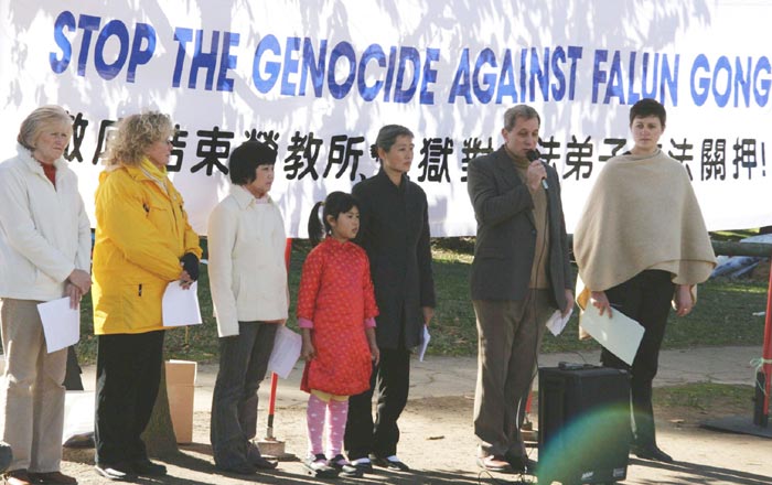 法轮功发言人Kay Rubacek女士在发言中表示,近四年来,法轮功团体第一次收到NCA(National Capital Authority)的许可,可以把横幅固定在地上,根据NCA条例:任何团体每月允许申请三天固定横幅在地上。但是唐纳的证书剥夺了我们这一权利长达四年。