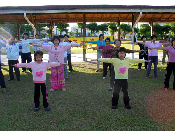 有一对10岁大双胞胎小弟子,在放寒暑假时,都会跟着爸妈早起炼功。双胞胎姊妹是早产儿,其中姊姊体质特差,心脏曾经开过刀,当时全身插满管子在医院里住院好长一段时间,妈妈非常担忧,虽然把孩子救了回来,但是手术后的问题还是不减,妈妈也因精神压力过大而得了忧郁症;此外,庞大的医药费,也让家里的经济捉襟见肘,全家都笼罩在一片阴云里。2001年6月,他们全家得法,全家的命运也得以改变:孩子健康活泼了,妈妈也开心的笑了。他们一家改变的过程,是法轮功修炼使身心升华的最好见证。如今,全家最快乐的日子,就是星期日到景点讲真相。